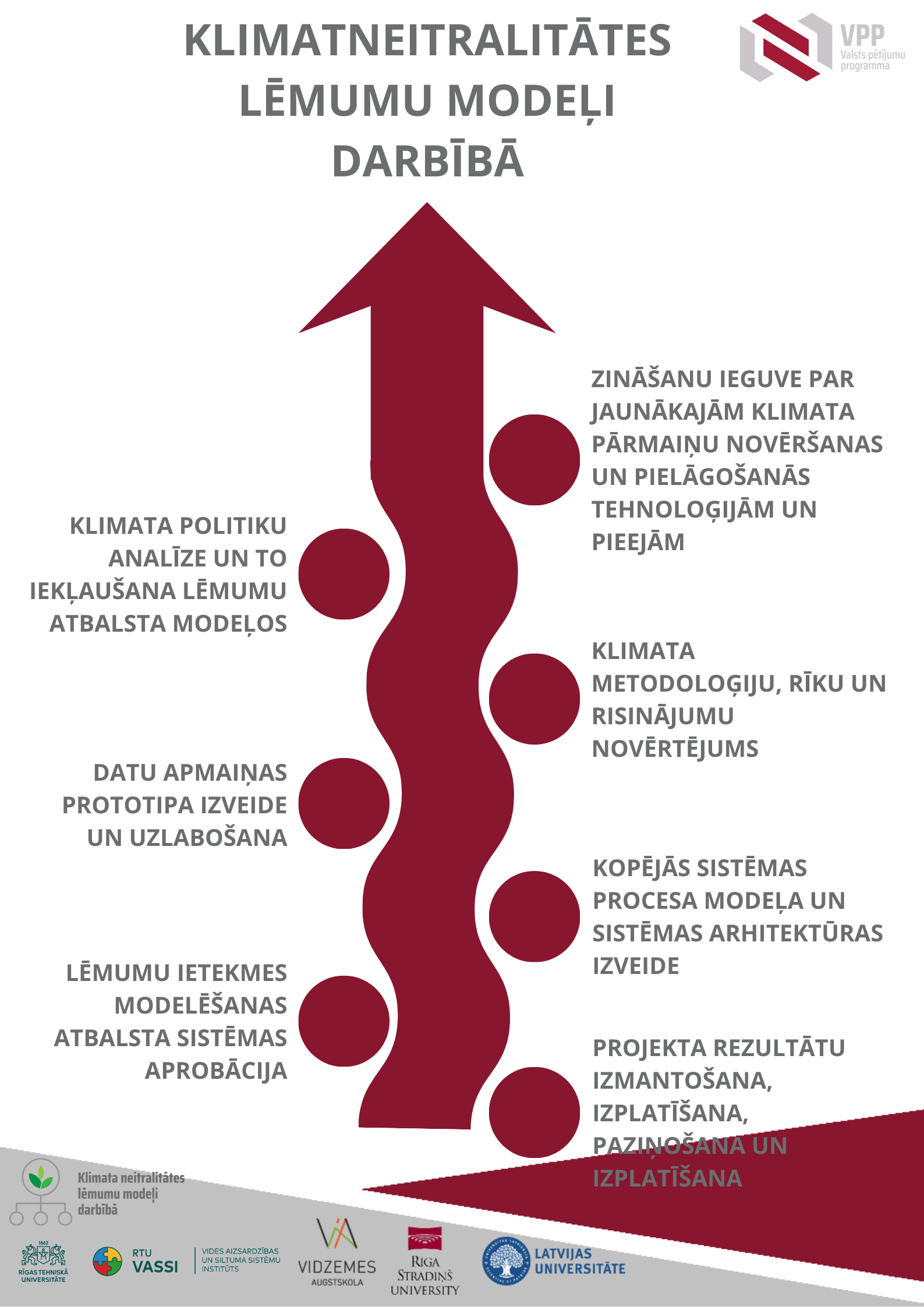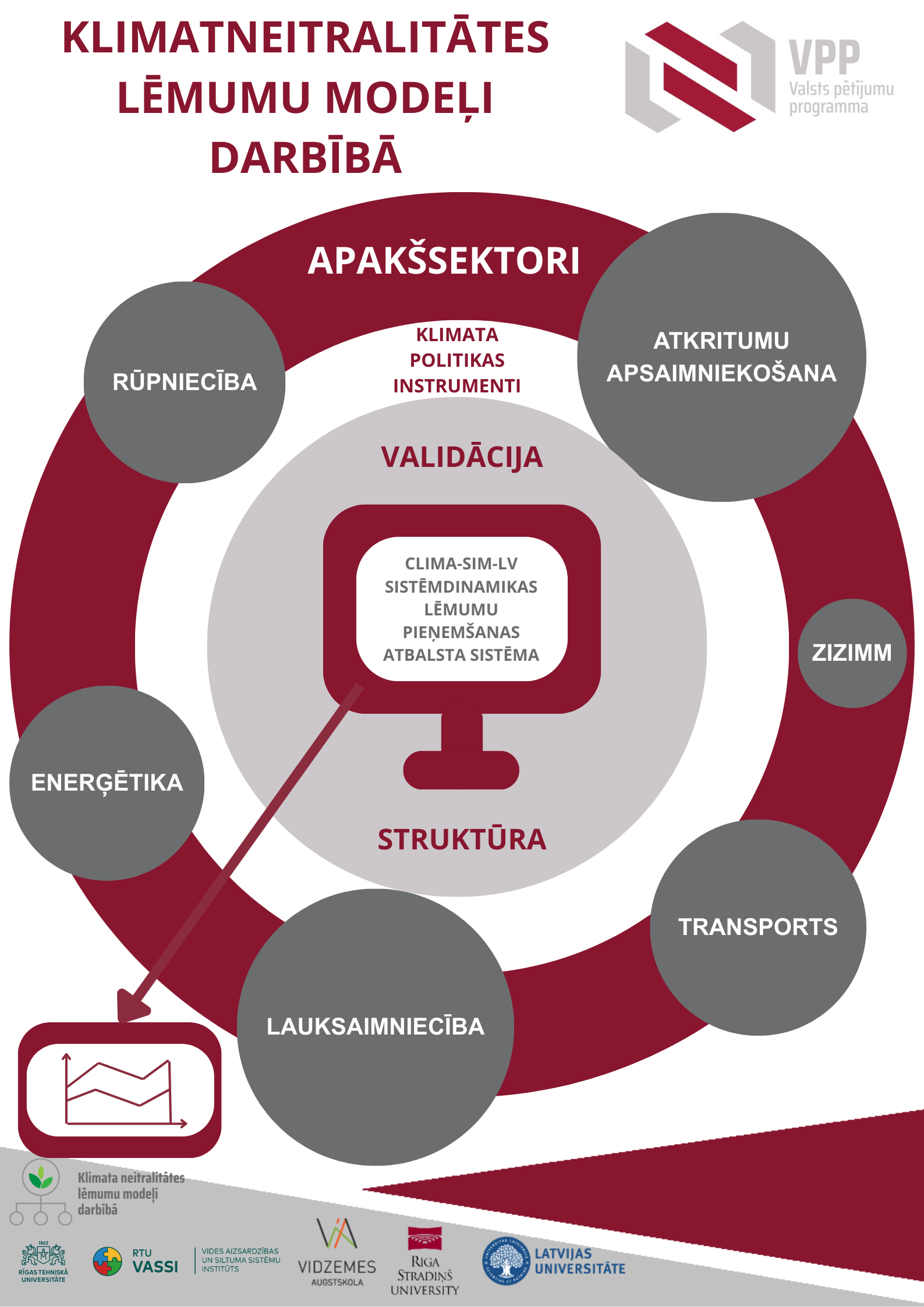 Projekta mērķis ir izveidot vienotu nacionālo lēmumu atbalsta instrumentu Latvijas klimatneitralitātes mērķa sasniegšanai. Galvenā uzmanība tiek pievērsta politikas lēmumu ietekmes modelēšanai dažādās nozarēs — enerģētikā, rūpnieciskajos procesos, lauksaimniecībā, ZIZIMM un atkritumu apsaimniekošanā. Projekta uzdevumi ietver klimata politikas saistību analīzi, klimata instrumentu novērtēšanu, inovatīvu tehnoloģiju identificēšanu un nepieciešamo datu apkopošanu. Plāns paredz izvērtēt, kā ES un Latvija ievēro klimata saistības, izvērtēt klimata pārmaiņu mazināšanas un pielāgošanās instrumentus, kā arī apzināt inovatīvas tehnoloģijas visās tautsaimniecības nozarēs. Projekta mērķis ir izstrādāt jaunus risinājumus klimata pārmaiņu ietekmes mazināšanai un novērtēt datu vajadzības un kvalitāti, uzsverot atbilstību normatīvajiem aktiem.